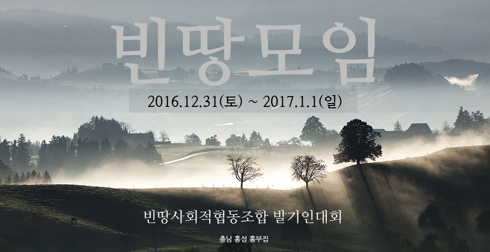 2016년 12월 31일(토), 그리고 2017년 1월 1일(일)에는 홍성 빈땅모임에서 빈땅사회적협동조합 창립을 해보려고 발기인대회를 열어요. 31일(토)에는 가까운 덕산온천에 다녀올 계획이에요. 1월1일에는 발기인대회를 진행합니다.