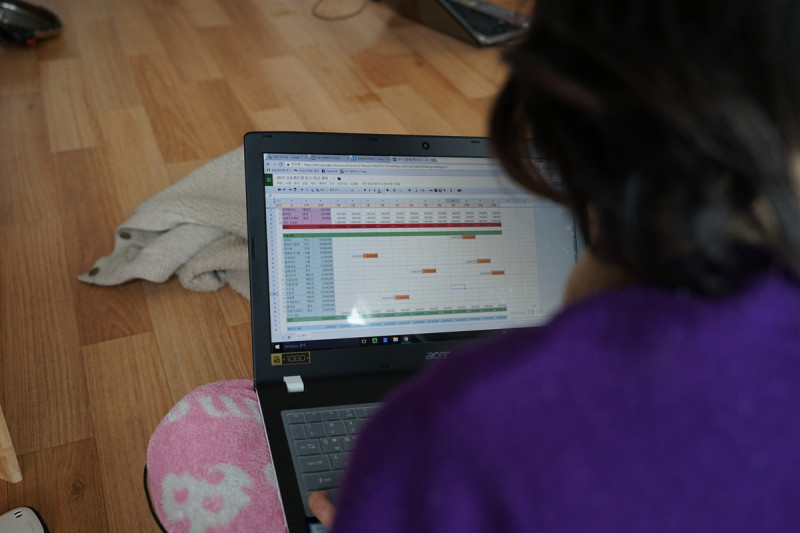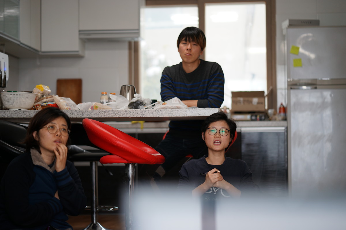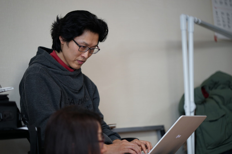 오디 상임활동가는 전체회의 중에도 작업에 여념이 없습니다.