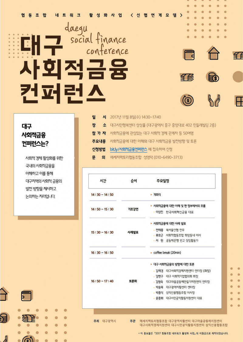대구 사회적 금융 컨퍼런스에 발표 세션으로 빈고가 초청을 받았습니다. 서원 상임활동가가 발표자로 참여합니다. 대구 지역 조합원분들의 관심 바랍니다.