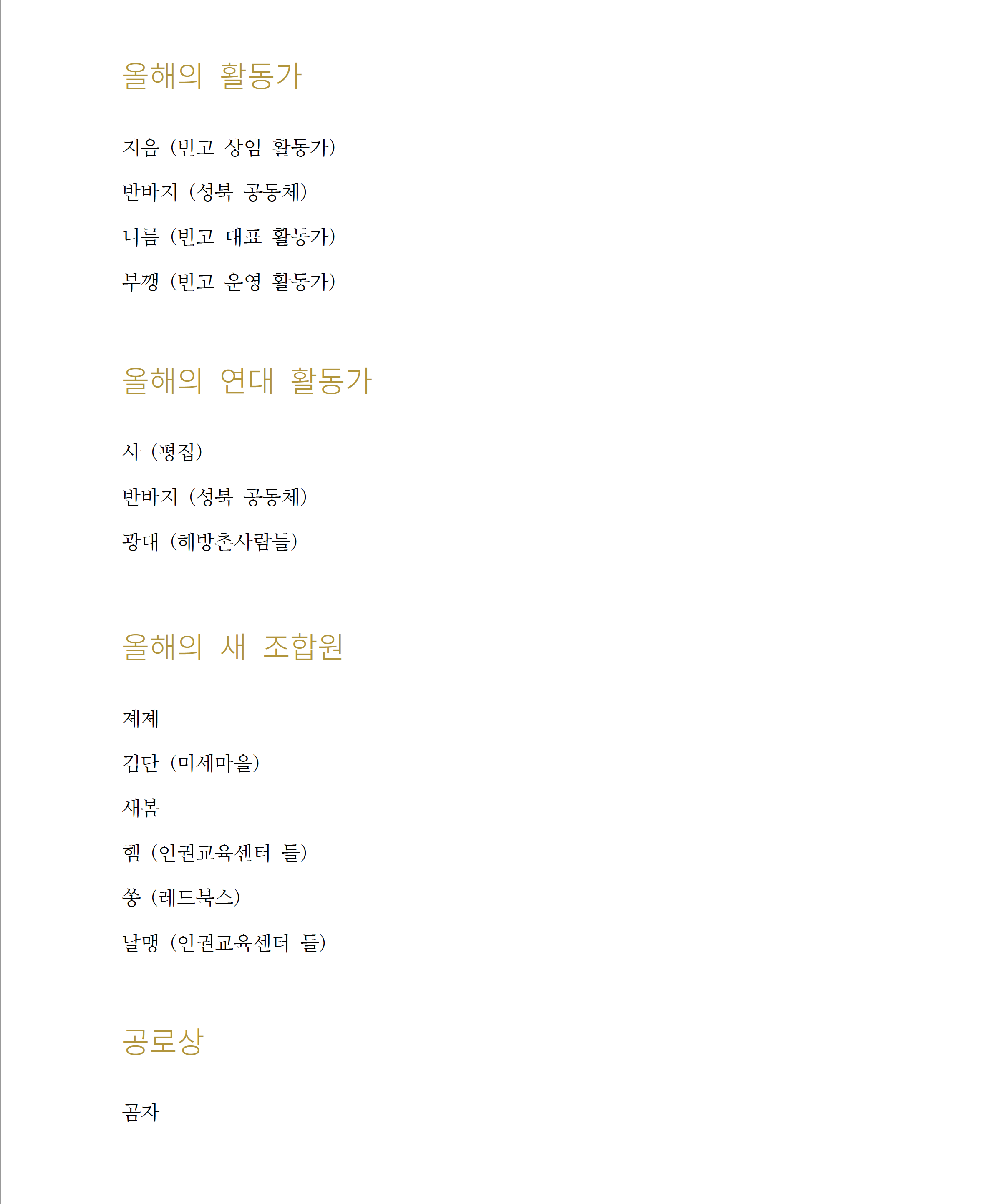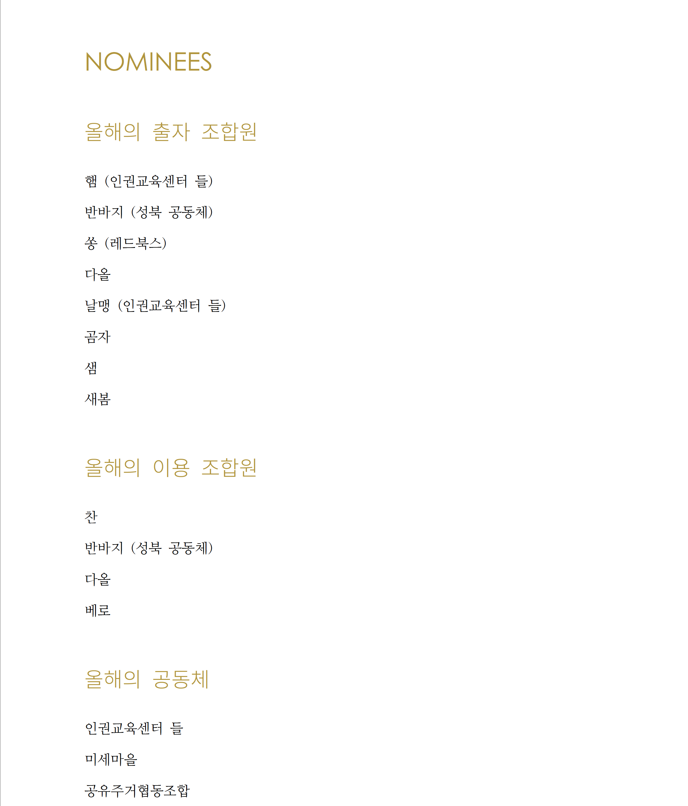 올 해로 3번 째 시상식을 맞는 빈고 어워드는 반자본금융을 통해 다른 질서를 만들고, 더불어 공동체와 공유지를 가꿔온 빈고 조합원/공동체에게 주어지는 매우 고결하고 영예로운 상입니다.