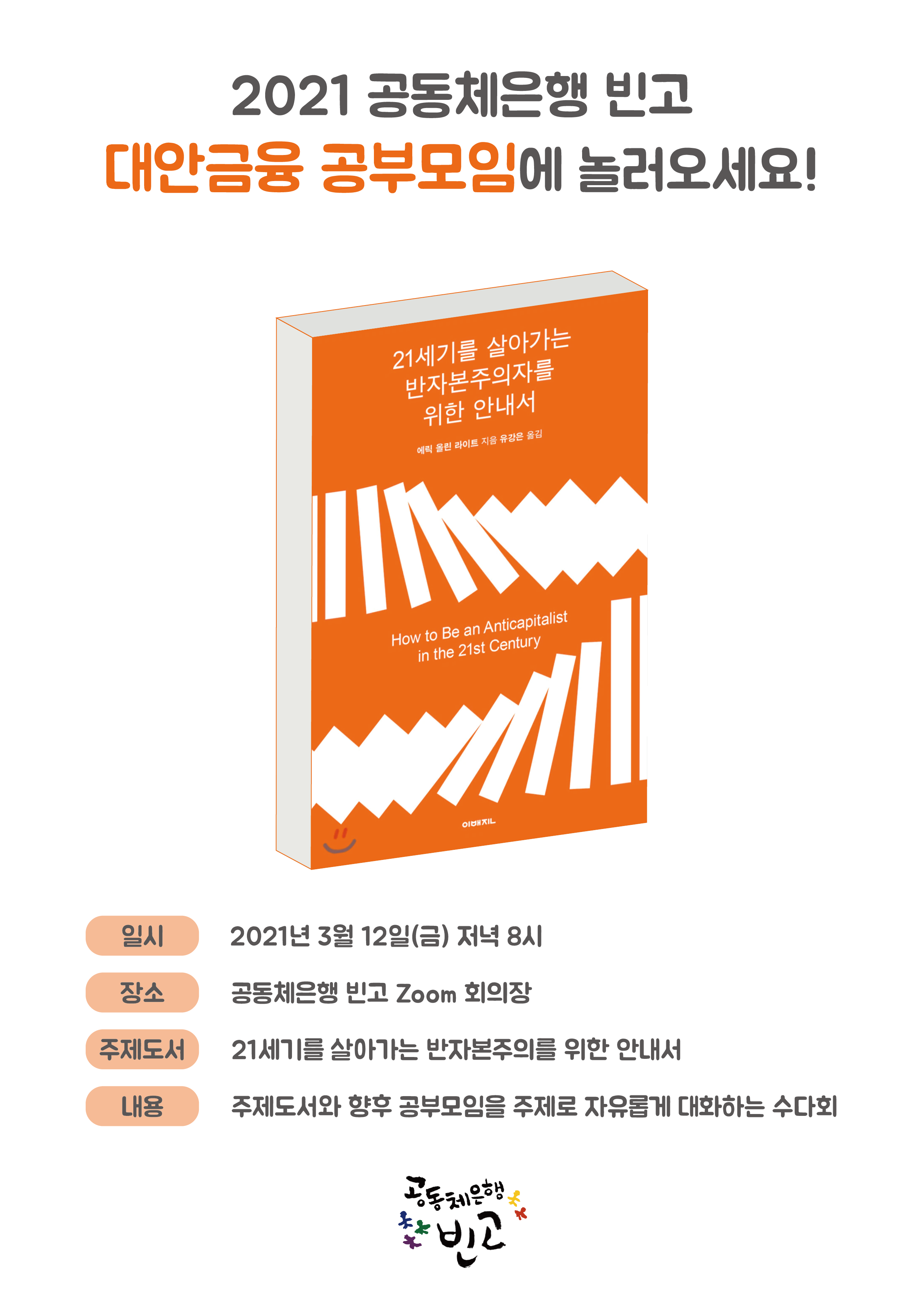 지음 : 세부적으로 들어가면 맑스주의나 사회운동 내의 논쟁지점에 대해 충분히 고려해서 나름의 방식으로 요약한. 애초부터 자본주의는 나쁜거지로 넘어가지 않고, 얼마나 나쁜지, 어쩔 수 없다고 생각하는 부분면서. 반자본주의라하면 생경하겠지만, 요런 지점에 대해서는 아니지 않도 고려하아? 이런 부분 잘 정리했다고 생각했다. 요정도로 설명하면 어느 정도, 상식선에서 충분히 동의받을 수 있는 내용이 아닐까. 정리를 잘했다는 느낌. 반자본주의 은행이라고 설명하는데 반자본이 뭐냐 물으면 자본주의 나쁘잖아로 설명을 하고 넘어가기도 하는데 막상, 이 정도면 자본주의 괜찮지 않아? 하면 설명하기 어려워진다. 약간 순화된 표현으로 공동체은행이라고 했기도 하다.