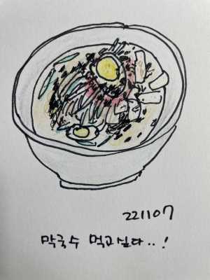 오늘은 제가 제일 좋아하는 막국수를 그렸습니다. 계란을 좋아해서 하나 더 넣었고, 고기는 뺐어요.^^