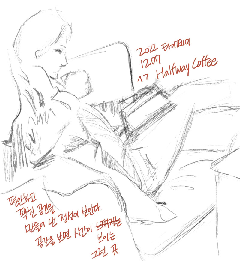 마이 걸어서 피곤한 다리 쉬느라 카페서 차 마시는 동행을 그리게 됐네엽.