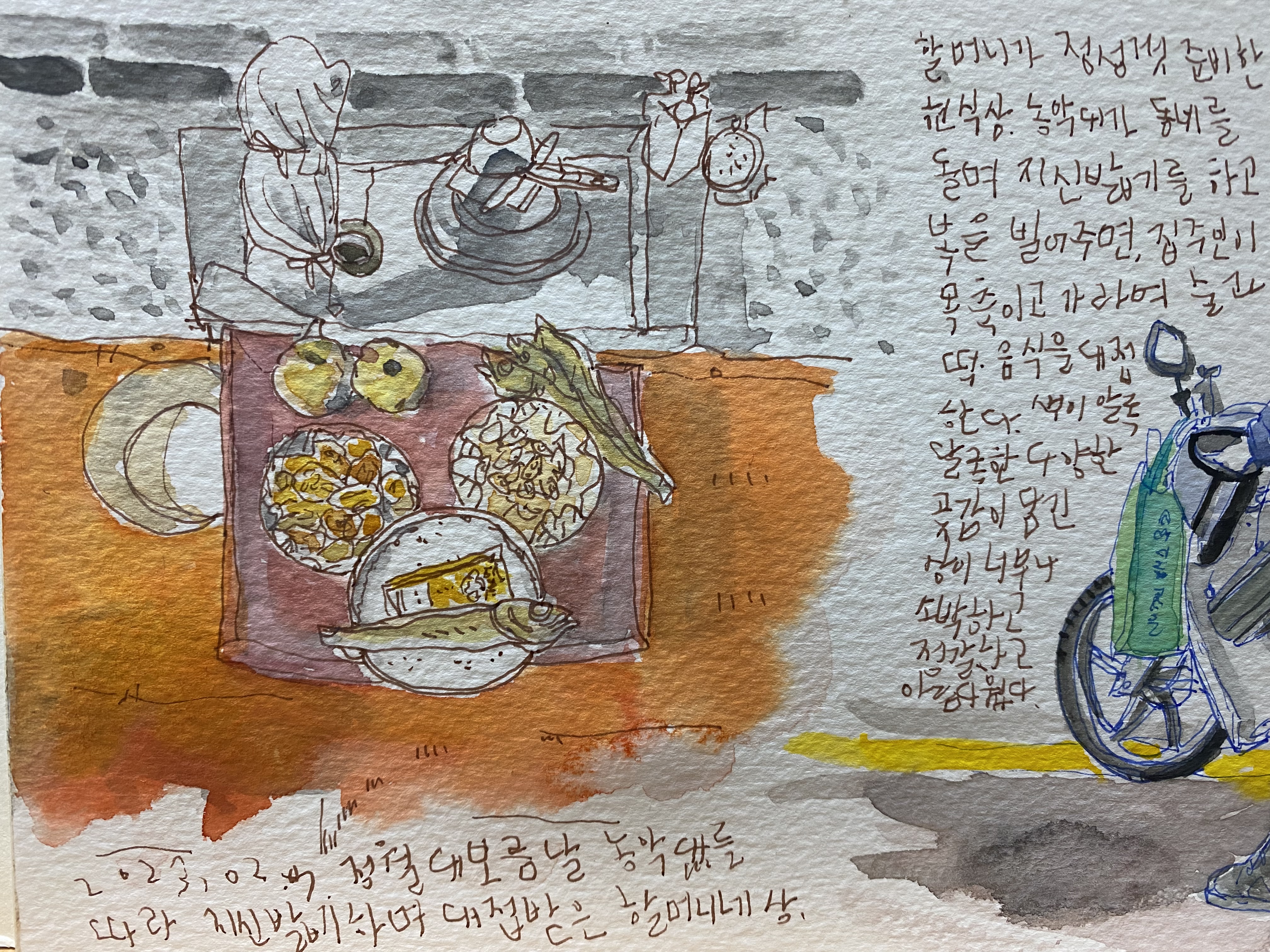 지난 주 토요일 정월대보름날에, 농부님들이 많이 사시는 마을 농악대를 따라 다니며 집집마다 복을 빌고 집주인들이 차려주시는 술과 음식을 얻어 먹었어요. 모두 귀하고 정성스러웠는데요, 그 중에서도 팔순이 넘는, 구순에 가까운 할머니들이 이 날을 위해 당신네들이 하실 수 있는 만큼 정갈하게 차려주신 상들은 왜 이렇게 아름다워 보이는지 모르겠어요.