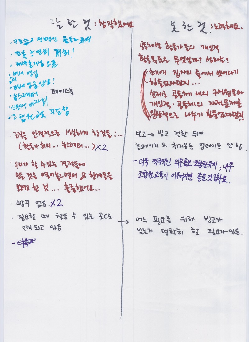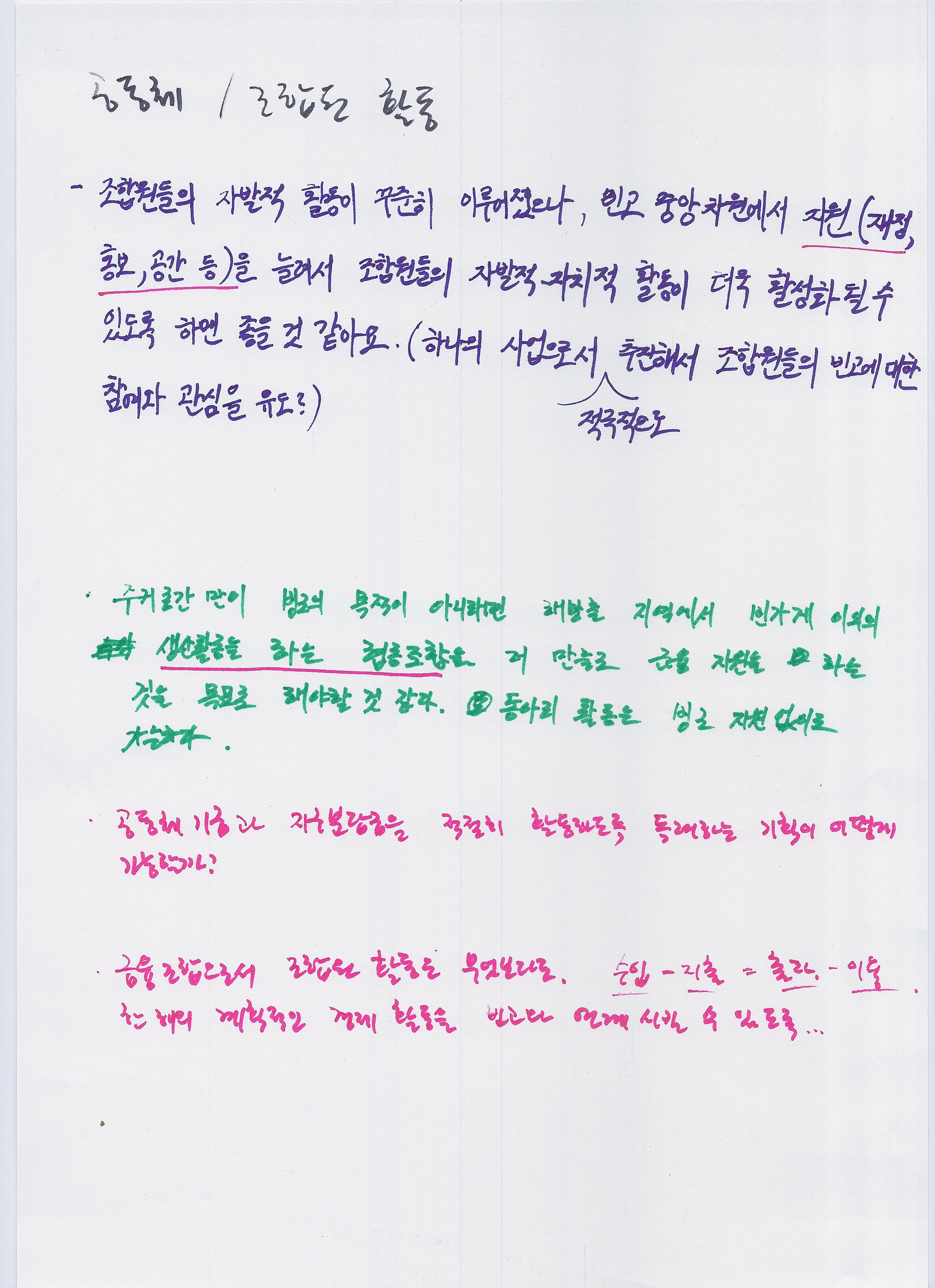 - 여건이 생긴다면 프로그램을 더 짜서 조합원 교육을 몇 번씩 받을 수 있으면 좋겠다. 한번으로 빙고 취지를 이해시키기 힘들다. 담당활동가가 죽어날지 모르겠지만 나눠서한다면.