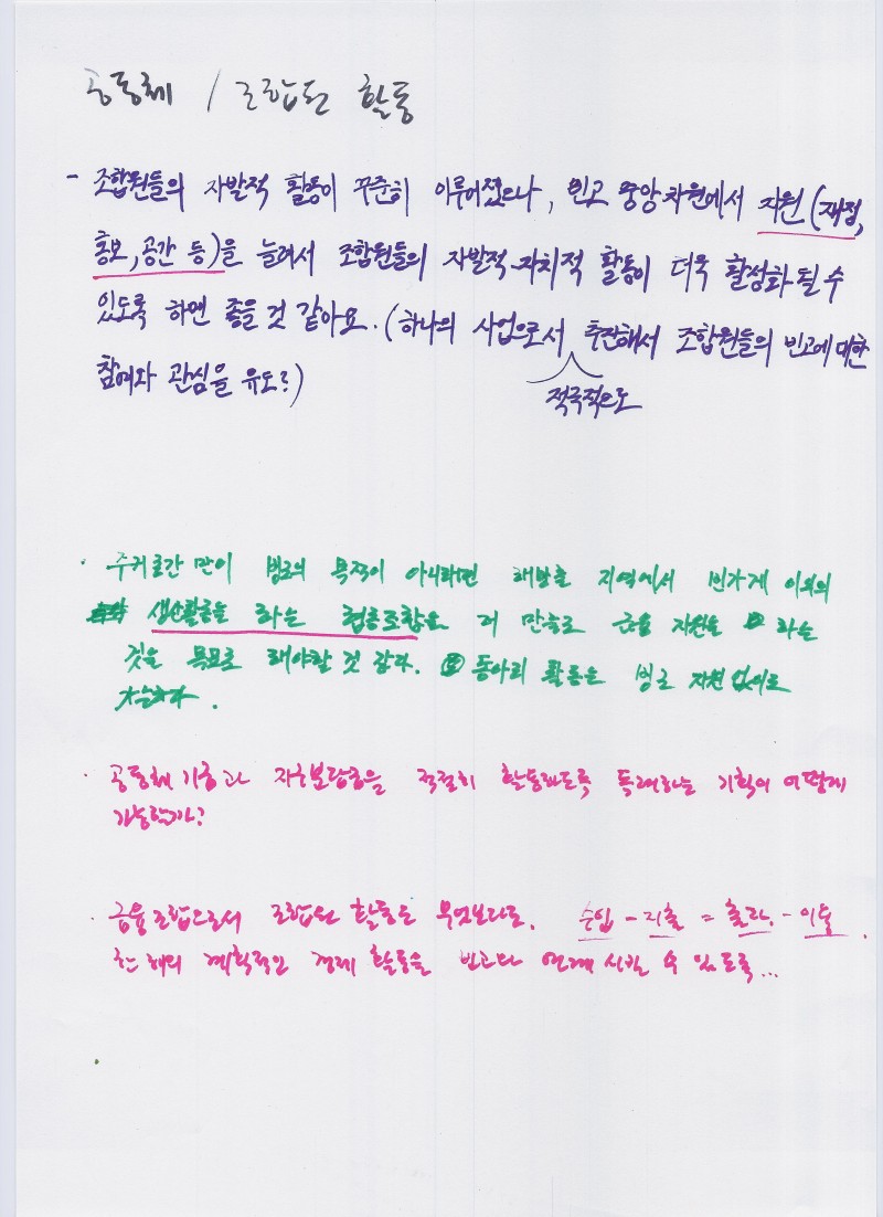 - 개인 조합원에 대한 관리 미흡 (1조합원 1공동체 시행...연락...) (개별 조합원 출자현황, 활동조합 정도에 따른 관리? 계획을 했으면 좋겠어요)