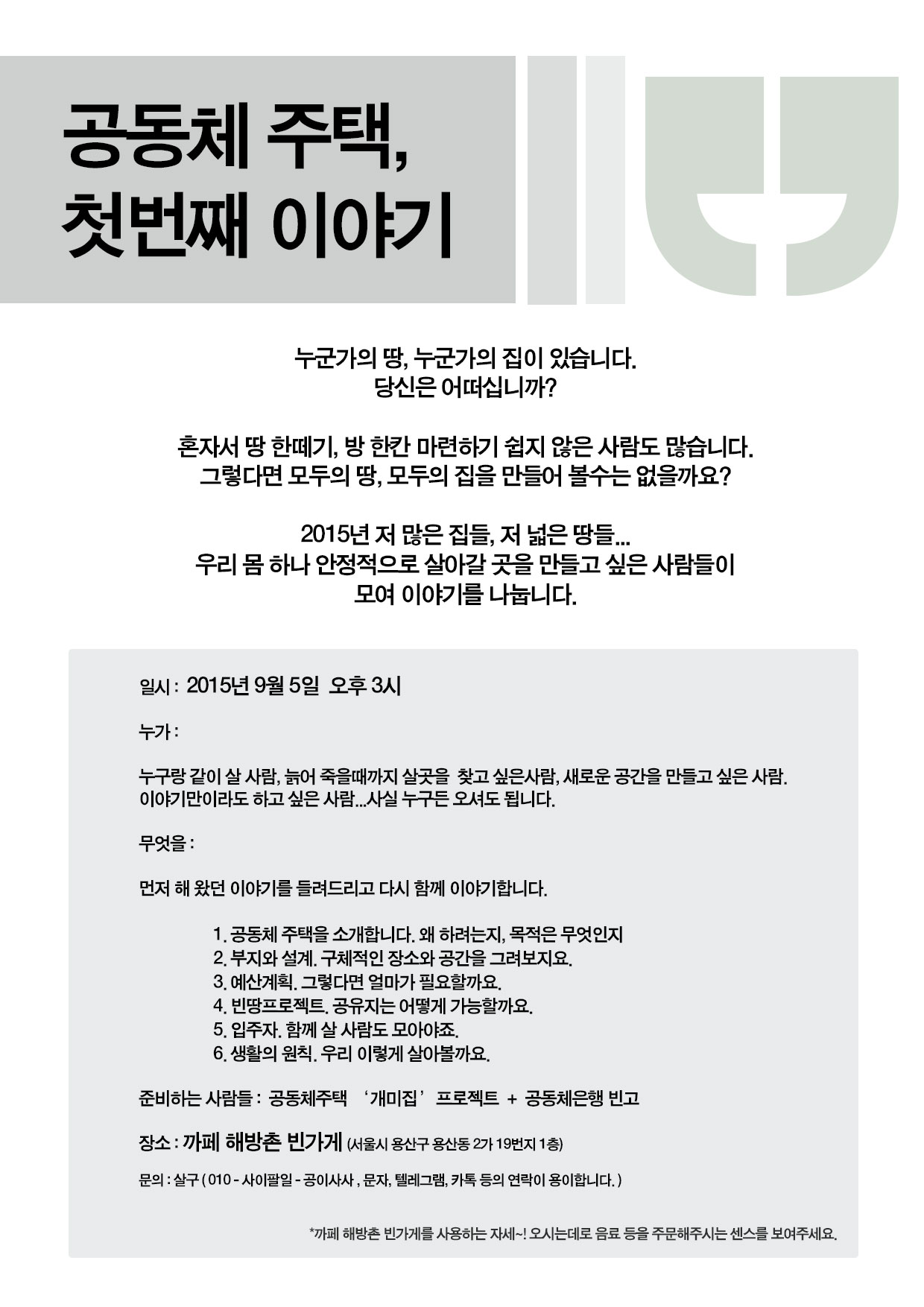 * 까페 해방촌 빈가게 공간을 이용합니다. 오시면 메뉴 하나씩 주문해 주시면 좋겠습니다.^^