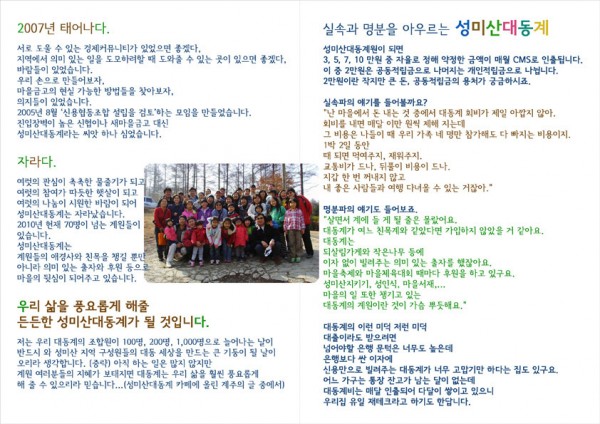 마을기업들이 소규모 자영업 형태로 운영되고 있어 수지의 균형이 제대로 이루어지지 않아서 겪는, 어쩌면 꺼내놓고 싶지 않은 이야기들도 서로 지혜를 모아보니 새로운 아이디어와 방법이 나오기도 했다. 서로 힘이 될 수 있다는 것을 알게 해준 좋은 경험이었다. 작지만 구체적인 협동, 특히 신용에 대한 믿음을 바탕으로 서로의 어려움과 기쁨을 같이 나누는 대동계는 우리 마을의 뿌리와 같은 역할을 하고 있다.