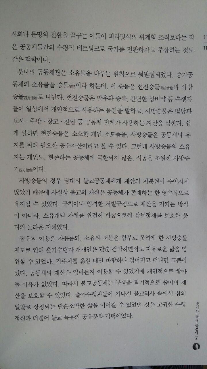 붓다의 공동체관은 소유물을 다루는 원칙으로 뒷받침되었다. 승가공동체의 소유물을 승물이라 하는데, 이 승물은 현전승물과 사방승물로 나뉜다. 현전승물은 발우와 승복, 간단한 상비약 등 수행자들이 일상에서 개인적으로 사용하는 물건을 말하고, 사방승물은 법당과 요사, 주방, 창고, 전답 등 공동체 전체가 사용하는 자산을 말한다. 쉽게 말하면 현전승물은 소소한 개인 소모품을, 사방승물은 공동체의 유지를 위해 필요한 공유자산이라고 볼 수 있다. 그런데 사방승물의 소유자는 개인도, 현존하는 공동체에 국한되지 않은, 시공을 초얼한 사방승가이다.