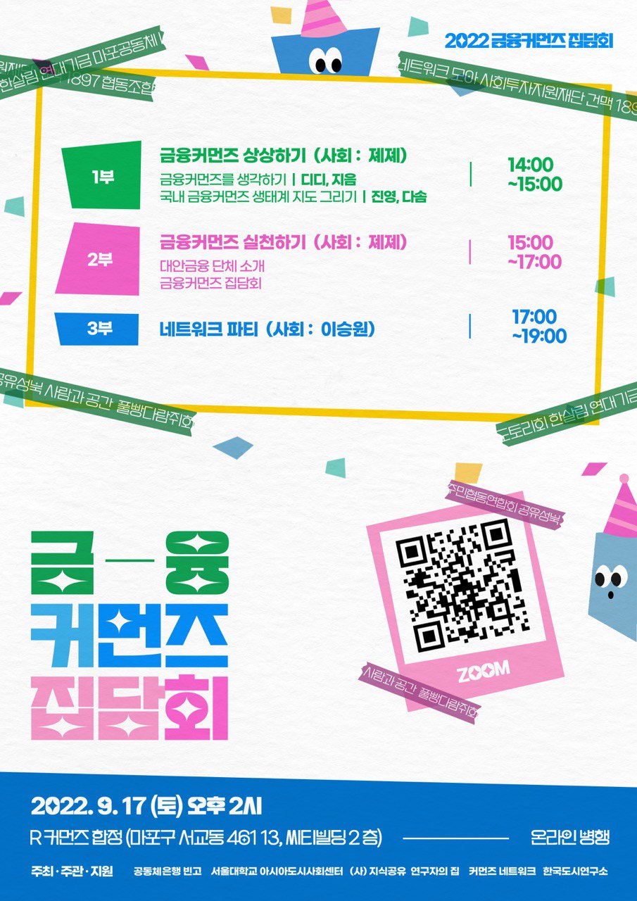 - 주최·주관·지원 단체: 공동체 은행 빈고, 서울대학교 아시아도시사회센터, (사)지식공유 연구자의 집, 커먼즈 네트워크, 한국도시연구소