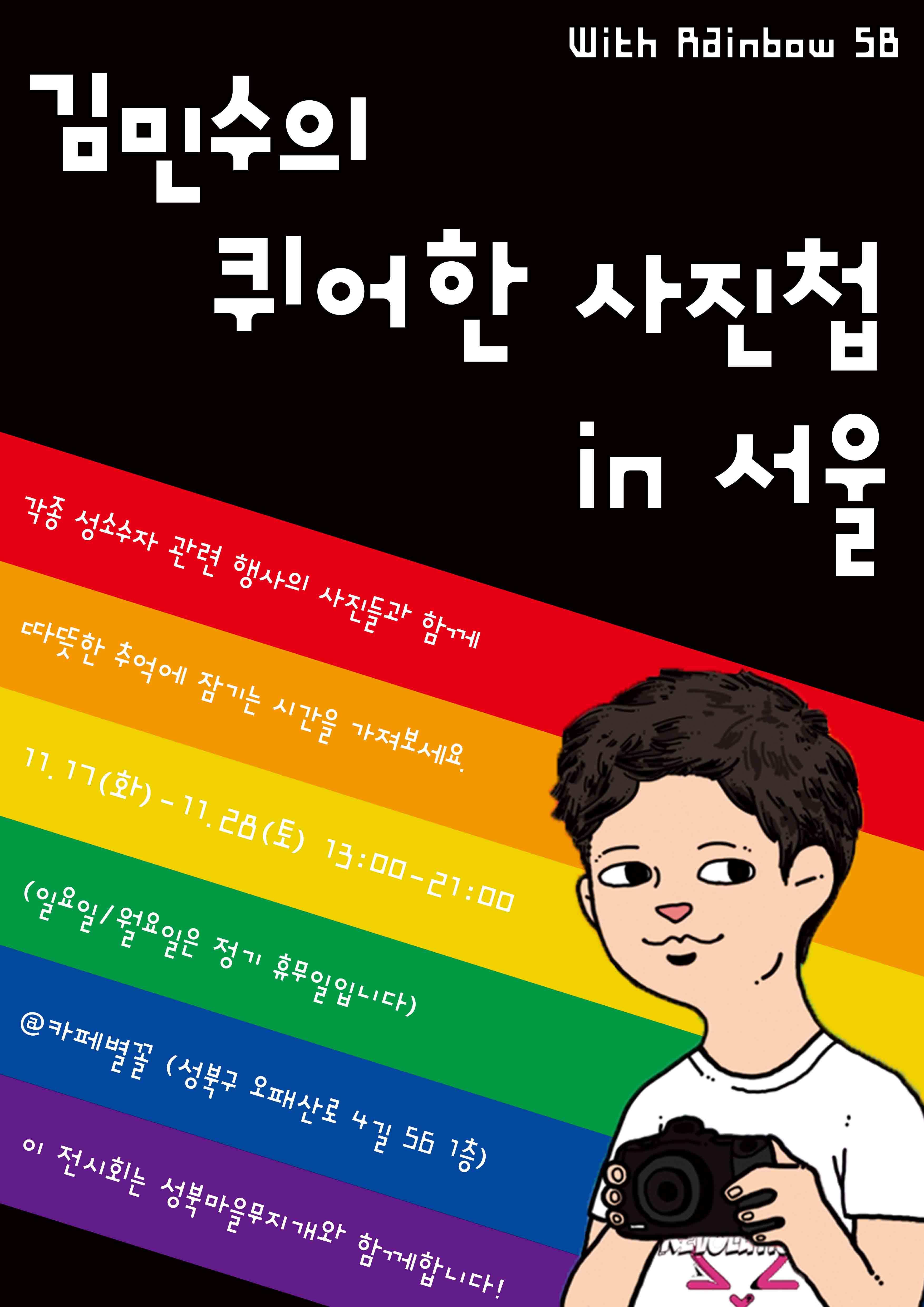 작가의 말 (전시 기획의도) 서울 전시회와 관련하여 초기에 막연하게 생각했던 전시회 컨셉과는 다른 무언가를 오사카 여행중에 떠올리게 되었습니다. 이전까지의 전국 투어 (?!) 전시를 하면서 제가 중점적으로 여겼던 부분은 가시성이었습니다. 성소수자와 관련한 이러한 일들이 한국에서 (혹은 해외에서) 있어왔다는 것을 알리는 것에 주 목적을 두었다…고 표현하면 그나마 근접한 것 같네요. 서울 전시는 이와 다르게, ‘추억하는 따뜻한 공간’을 만들어보고 싶어졌습니다. 지방과는 다르게 서울은 성소수자 인권과 관련한 움직임이 지속적으로 있어왔던 도시입니다. 운동에 적극적으로 참여하는 사람들도 포함해서, 성소수자 당사자들이 가장 많이 살고 있는 도시이지요. 때문에 가시성 보다는 이때까지 걸어왔던 발자취에 대한 추억을 더듬는 공간 또한 함께 될 수 있다면 좋을 것 같습니다. 그리고 이 컨셉을 잘 표현하는 데 있어서는 아무래도 추억을 어떻게 되새길 것인가가 관건이 되지 않을까 합니다. 그래서 김민수의 퀴어한 사진첩 이라는 이름에 맞춰서 전시와 병행하여 “앨범” 열람을 할까 생각중입니다. 제가 작년 퀴어문화축제/대구퀴어문화축제의 사진을 앨범으로 만들어서 들고 다니며 사람들과 이야기도 하고 나눴었던 경험이 있습니다. 그 때 제가 만든 앨범을 보면서 사람들이랑 이야기 나누고 즐거운 시간을 가졌었던 사람들의 모습이 꽤 따뜻해 보였습니다. 이번에도 그런 자리를 전시회를 통해 만들 수 있다면 저로써도 굉장히 좋을 것 같아요. |