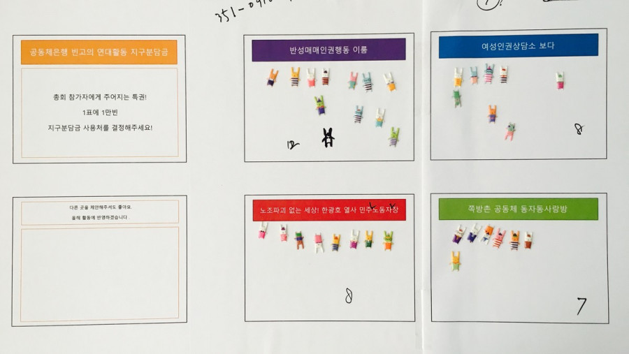 지난 총회(3월4일) 현장에서 지구분담금 특별기금을 모금하는 행사를 진행했고, 참석 조합원들이 스티커를 부착하는 방식으로 총 4개의 단체에 지구분담금을 할당했습니다. 애초 각 스티커는 1만빈의 가치를 가졌으나, 보다 의미 있는 기금으로서 사용되기 위해 운영활동가들의 의결을 거쳐 2만빈으로 가치를 상향하였습니다. 아래는 3월 24일 최종 전달된 지구분담금의 내역입니다. 앞으로도 더 많은 곳에 지구분담금이 사용될 수 있도록 조합원들의 많은 관심 바랍니다.