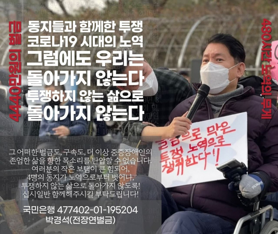 그 어떠한 벌금도, 구속도, 감금도, 더 이상 중증장애인의 존엄한 삶을 향한 목소리를 탄압할 수 없습니다. 여러분의 작은 보탬이 큰 힘되어, 4명의 동지가 하루라도 빨리 노역으로부터 벗어나, 투쟁하지 않는 삶으로 돌아가지 않도록! 십시일반 함께해주시길 부탁드립니다! 빈고 조합원들도 함께 해주시길 바랍니다.