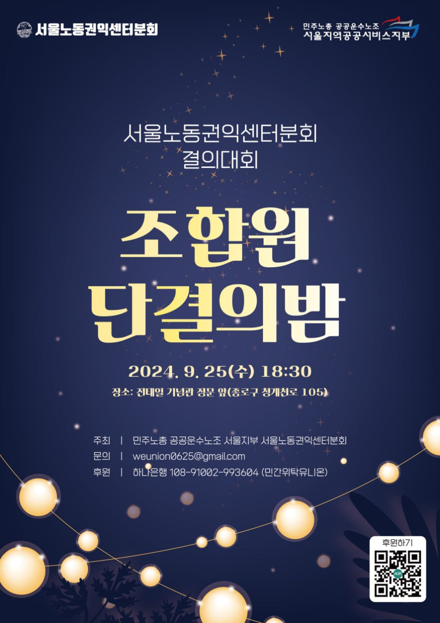 안녕하세요 동지들! 공공운수노조 서울지부 서울노동권익센터분회입니다. 지난 910 총파업을 시작으로, 서울노동권익센터 노동자들은 올초 한국노총 서울본부로 센터 하청 운영기관이 바뀐 후 일방 해지된 단체협약과 임금 개악 저지를 위한 투쟁을 이어가고 있습니다. 날이 많이 풀린 가을 밤, 서울노동권익센터분회 결의대회가 예정되어 있습니다. 결의대회 진행 후, 가을 밤의 환한 달빛과 시원한 바람을 맞으며 전태일기념관 앞 야외에서 도란도란 맛있는것 먹으며 맥주, 막걸리 한잔 동지들과 함께 하려 합니다. 많은 동지들의 연대와 참여 부탁드립니다. 감사합니다! □서울노동권익센터분회 결의대회 - 조합원 단결의 밤 -일시 : 2024년 9월 25일 (수) 18:30 -장소 : 전태일기념관 정문 앞 (종로구 청계천로 105) -후원 : 하나은행 108-91002-993604(민간위탁유니온) |