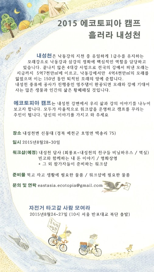 에코토피아 캠프에서는 내성천 강변에서 우리 삶과 강에 대한 이야기를 나누었습니다. 모두가 자율적으로 워크샵을 운영하고 캠프를 꾸렸습니다. 모래강에서 이제는 풀밭이 되어버린 내성천을 돌아보며 무분별한 개발사업이 환경에 끼치는 영향을 살펴봤습니다. |