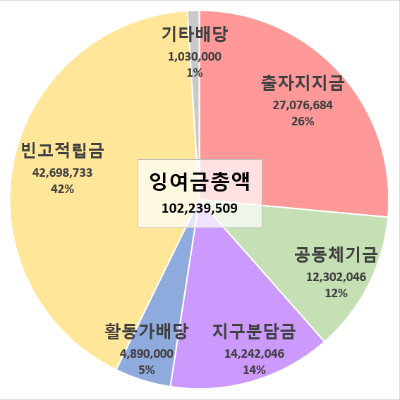- 조합원배당 : 조합원 전체에게 동일 금액을 일괄 분배하는 금액.