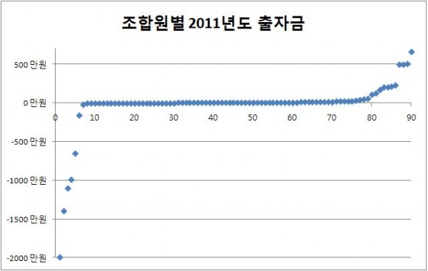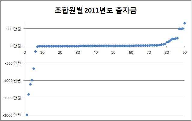 * 2011년에 각 조합원이 출자하고 반환한 출자금을 높은 순서대로 나열한 그래프.