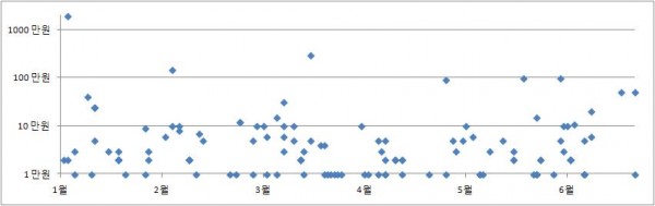 * 각 점은 각각 하나의 출자를 표시함. 대략의 날짜와 금액을 나타낸 그림.