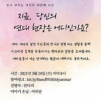 <빈고 보이는 라디오> 세번째 시간 “지금 당신의 연대 현장은 어디인가요?”데모는 습관, 성명서는 일상.‘저항다반사抵抗茶飯事’를 살아가는 판다리가 바다 너머 낯선 시민들과 만나고 연결되는 경험을 통해, 삶에 스며든 폭력과 자본의 모습을 알아가고 시끄러운 공백을 만들어가는 장면을 소개합니다. 그러다가 요즘 함께하게 된, 反자본주의 反기후위기적 미얀마 연대투쟁에 대해서도 살짝 소개하고 연대의 마음을 나누고자 합니다. 여러분들이 지금 연대하는 현장에 대해서도 들려주세요.- 시간: 2021년 3월 24일 (수) 저녁 8시- 참여…